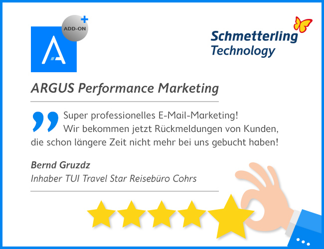 ARGUS Performance Marketing ist eine leistungsstarke Performance Marketing-Lösung, mit der Sie vollautomatisiert und dennoch persönlich mit Ihren Kunden in Kontakt bleiben. Schmetterling Technology unterstützt Sie dabei permanent bei Ihren Kunden im Gedächtnis zu bleiben.