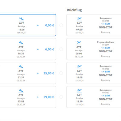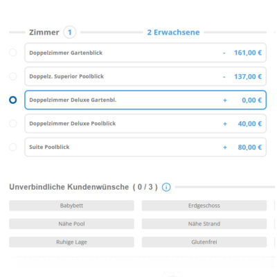Zimmerkategorie, Verpflegungstyp und Flugzeiten