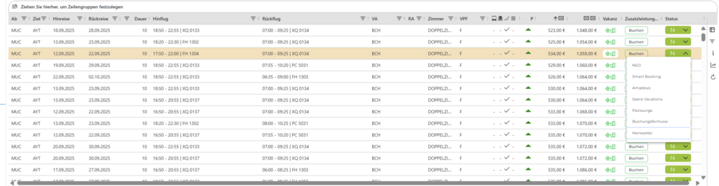 Mit Klick auf den Button „Prüfen“ können Sie den Flug direkt abfragen und ans Reservierungssystem NEO oder Smart Booking – je nach Software-Ausstattung oder Veranstalter – an Amadeus, Sabre Vacations, TUI IRIS.plus, Der TravelCompass, UI:Office, oder paxlounge übergeben.