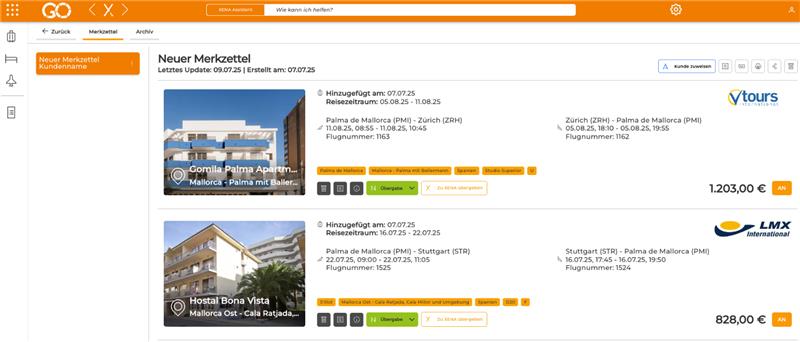 Über das Dokument-Symbol im linken Seitenmenü gelangen Sie jederzeit zu Ihren gespeicherten Merkzetteln und erhalten dort eine übersichtliche Darstellung aller gemerkten Angebote inklusive wichtiger Details wie Reisezeitraum, Flugverbindungen, Hotelinformationen und Preis.